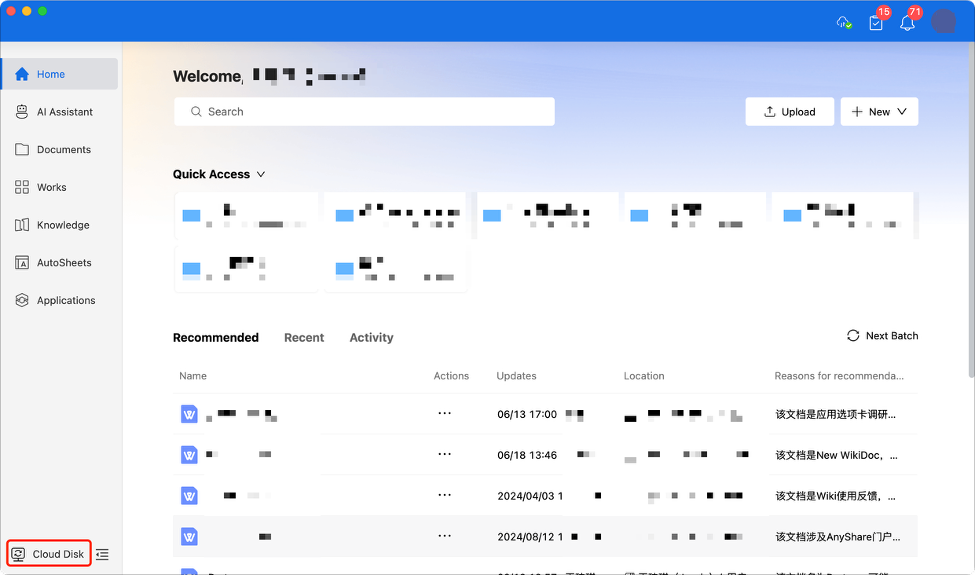 Option 2: After logging into the client, locate and click the Cloud Disk entry in the lower-left corner to activate it.