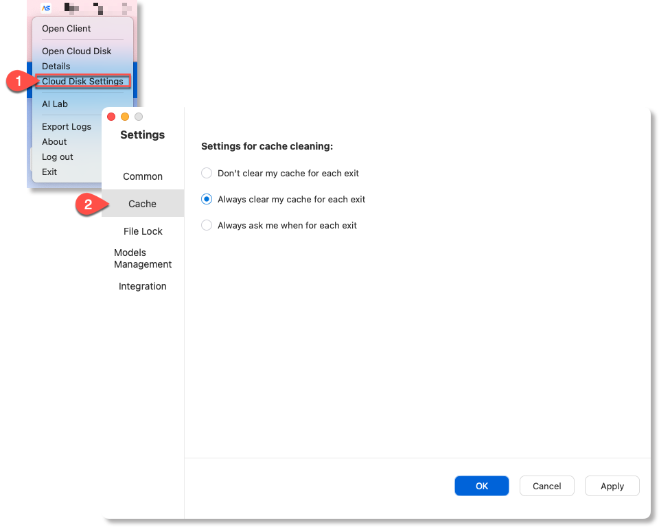 • Configure whether to clear local cache when closing the client (default: Retain cache when exiting client).