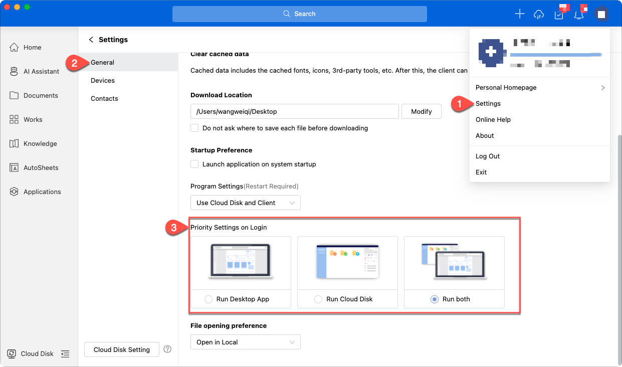 The client and cloud disk launch simultaneously by default upon login. Modify this behavior via [Settings] > [General] > [Priority Settings on Login].