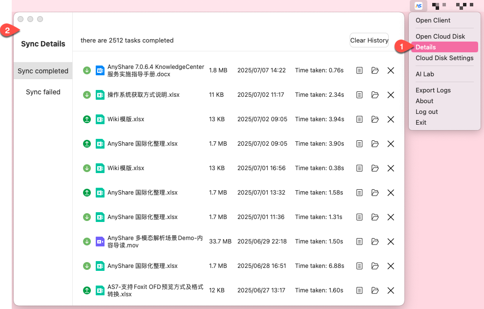 Click [Details] > [Sync Details] in the system tray menu to access comprehensive records of completed operations (downloads, uploads, renames, deletions), displaying file names, sizes, timestamps, duration, and failure reasons—with interactive buttons for each entry.