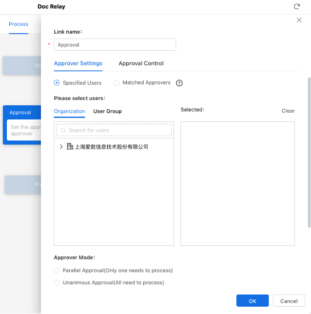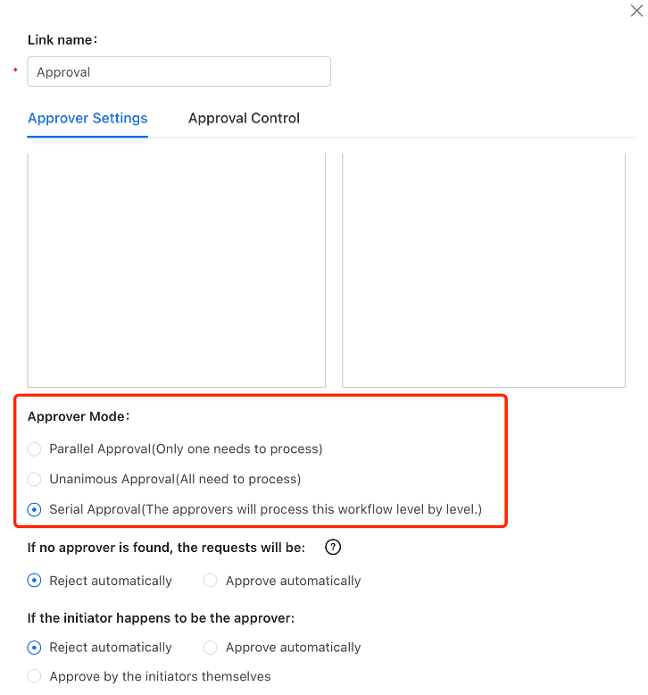 2)If no templates are available, click any process step to enter the configuration page. Set the desired link name, approver, approver mode (parallel/unanimous).