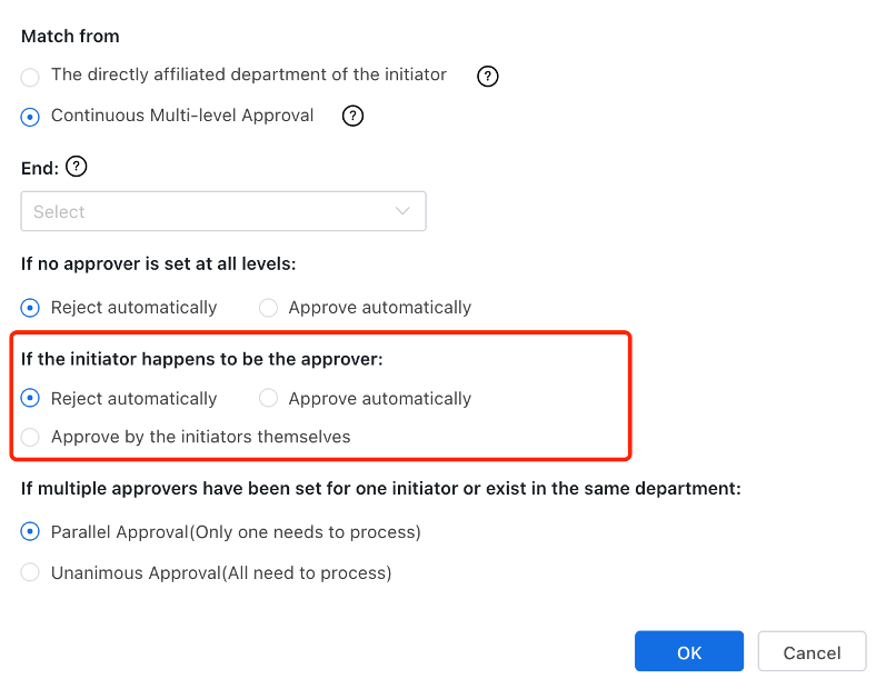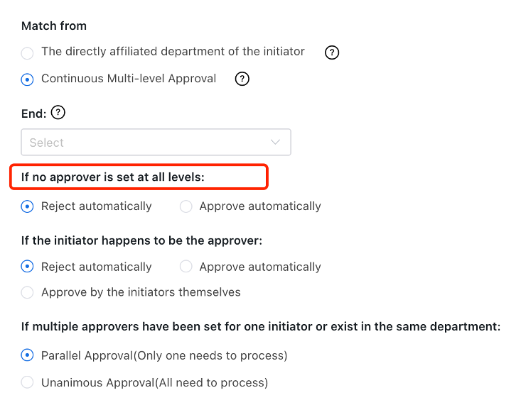 If no approver is matched at the final designated hierarchy level, you may configure this approval to either auto-reject or auto-approve.