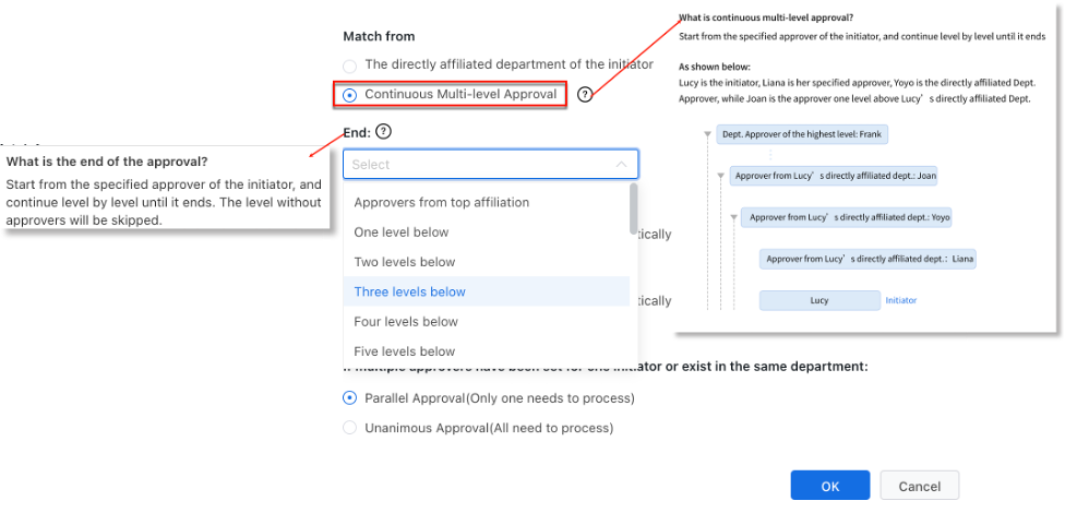 For scenarios requiring approval from every department head in the hierarchy, enable [Continuous Multi-Level Approval] and configure the final approval endpoint in the workflow.