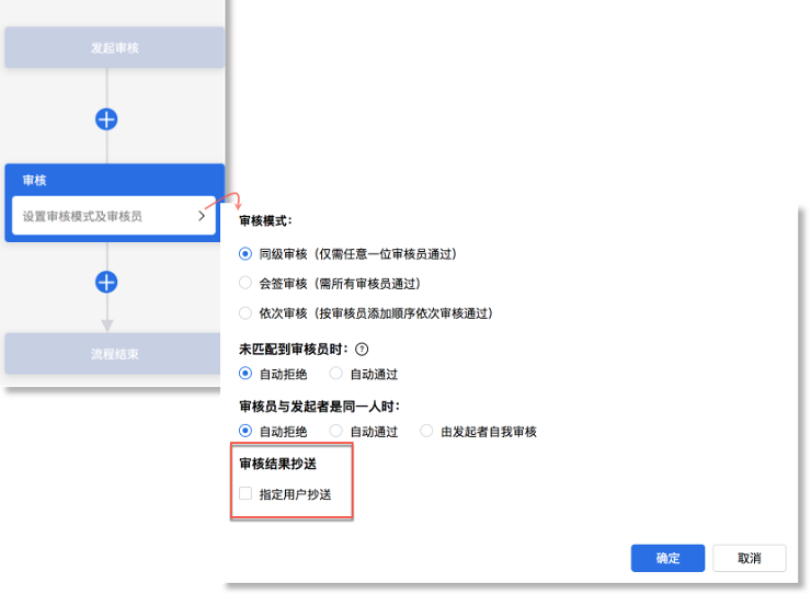 For peer-level document transfer approvals, configure CC notifications during workflow setup to automatically share approval results with designated non-approvers at the same organizational level.
