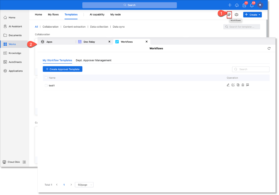 Alternatively, access the“”option in the top-right corner of the Works to manage all approval templates (add/delete/modify).