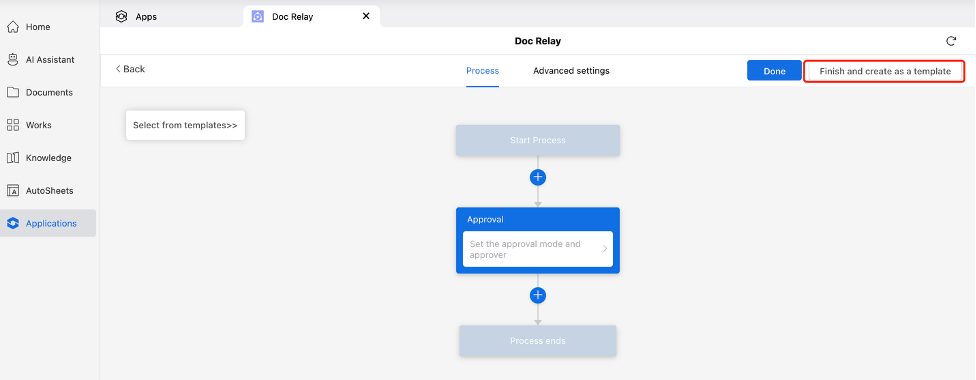 After setting up an approval process for a specific business case, users may click [Finish and create as a template] upon completion, assign a template name, and directly select it for future reuse.