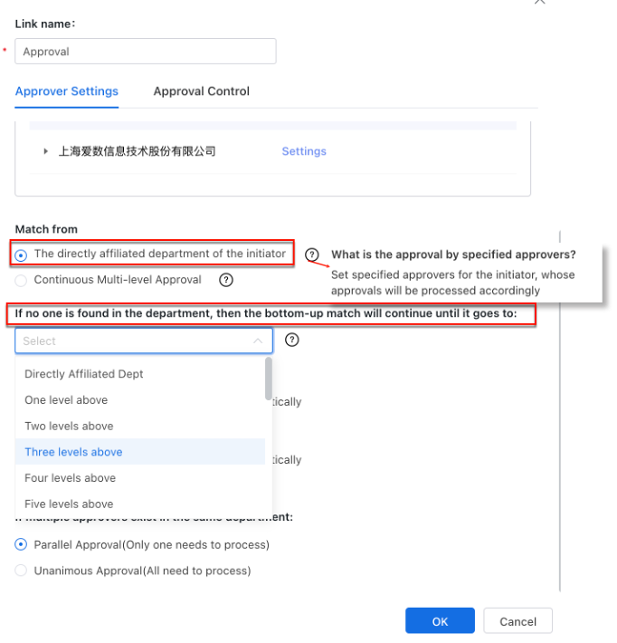 Then configure the matching hierarchy level. When enabled, set fallback approval chains for initiators without pre-assigned approvers