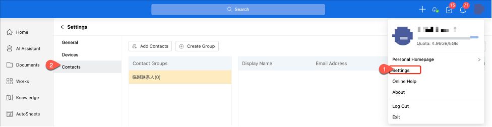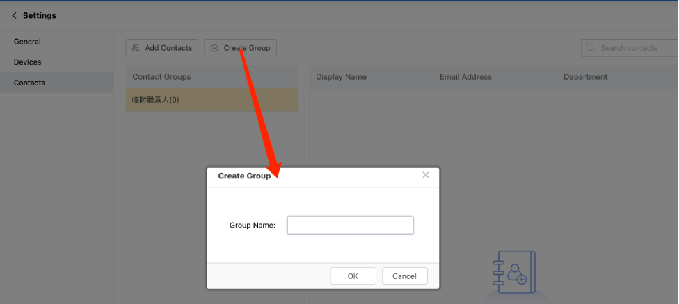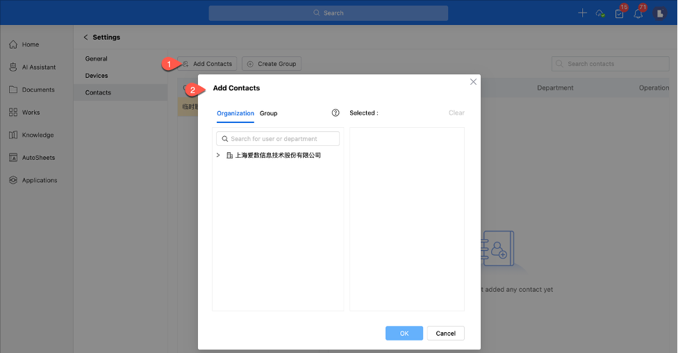 AnyShare provides a default temporary contacts group, click [Add Contacts] above to include members in this group.