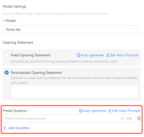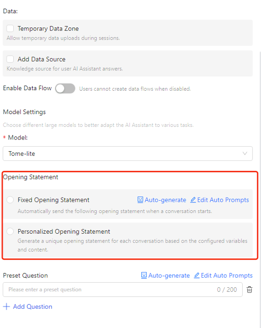 • Fixed Opening Statement: When users initiate a conversation, the AI assistant will automatically send the predefined message configured here. Click "