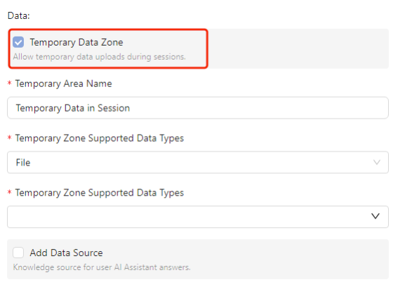 • Temporary Data Zone: Allow users to upload temporary data during sessions. Configurations require specifying the zone name, supported data types and accepted formats.