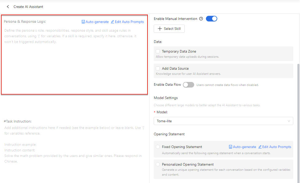 • Blank AI Assistant: Select [New Blank AI Assistant] for complete customization, requiring full parameter configuration