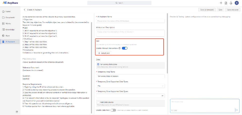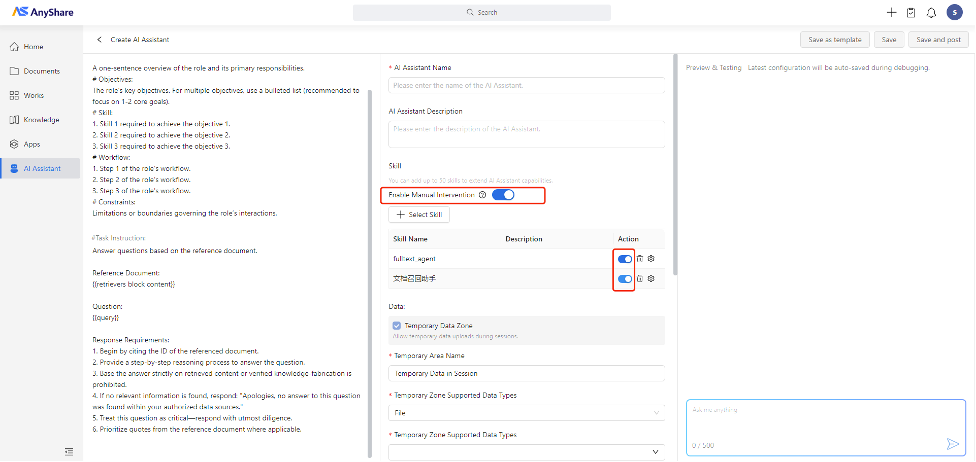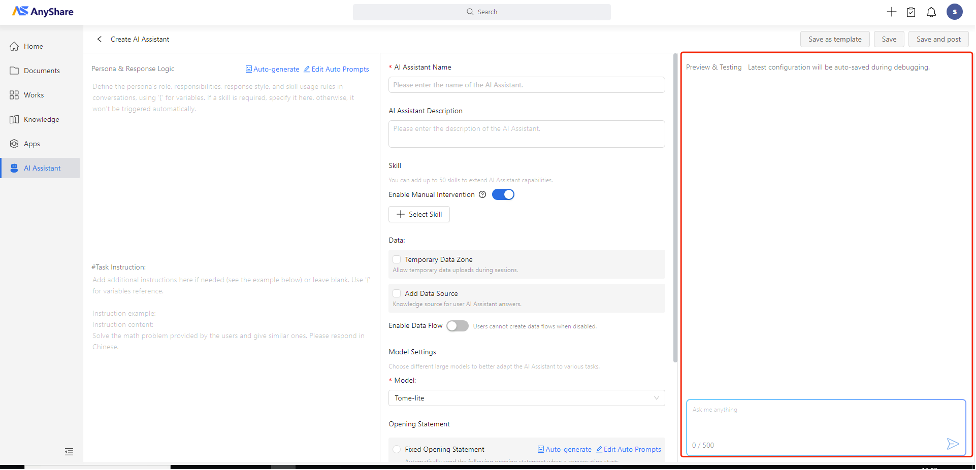 After completing the configuration, you can preview the AI Assistant’s performance by interact with test chat panel on the right side of the interface. Adjust parameters as needed before final post.