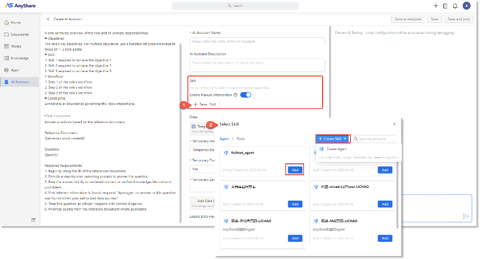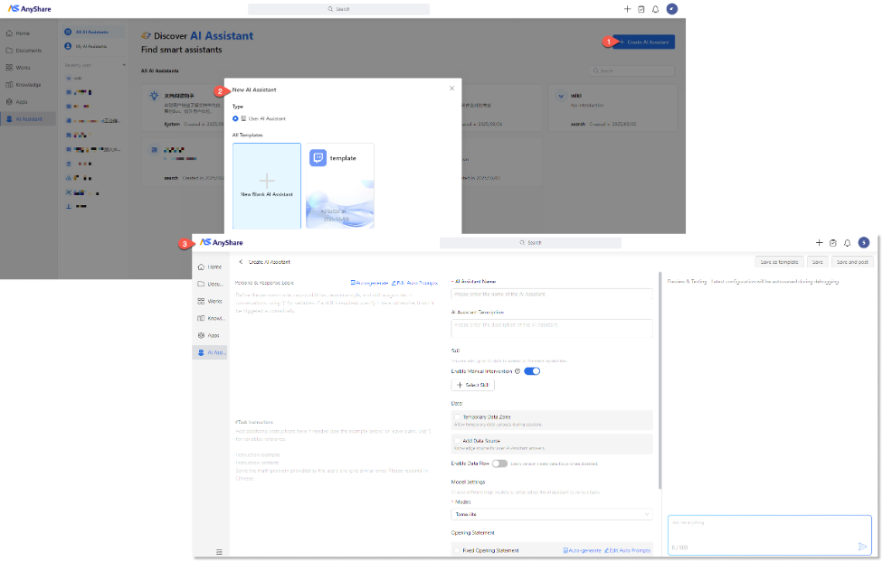 Then, navigate to My AI Assistants to post the template. Once posted, authorized users can apply the template in similar scenarios and create New AI Assistant rapidly.