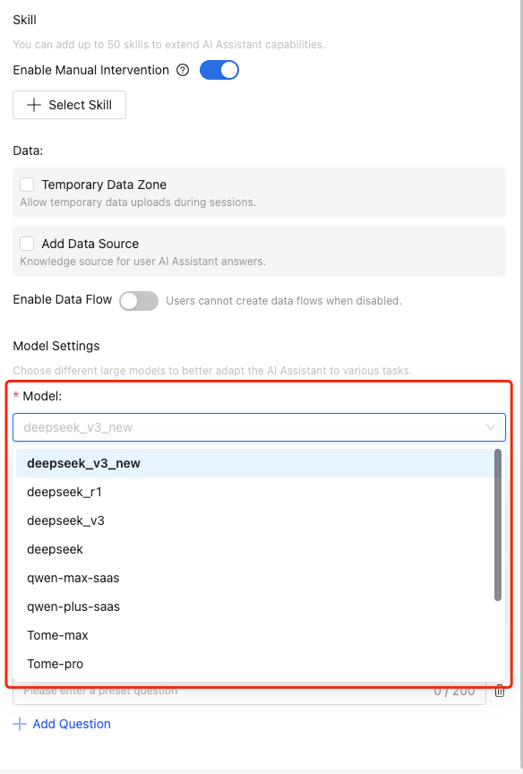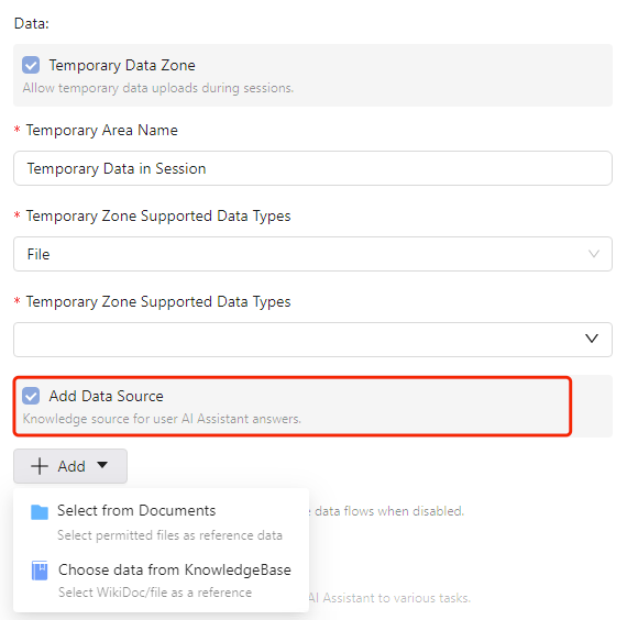 • Add Data Source: Designates knowledge sources (documents/knowledgebases) for intelligent Q&A.