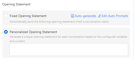 • Personalized Opening Statement: When users initiate conversations, the AI assistant dynamically generates customized opening statements based on the configured variables and content below.