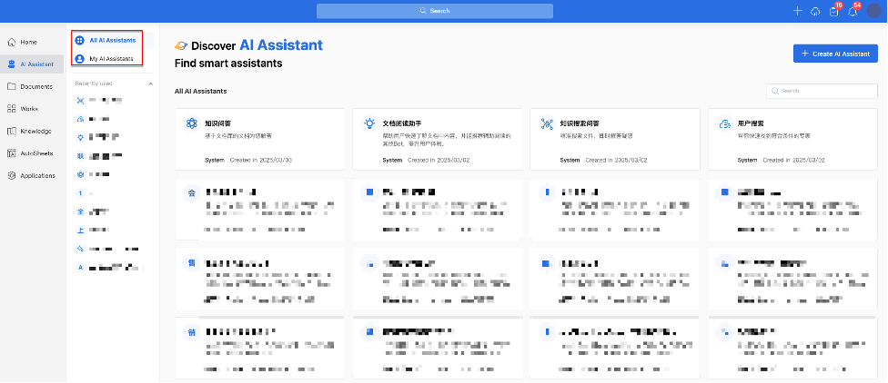 Enter the AI Assistant, select "All AI Assistants" from the sidebar to view all posted AI Assistants in the system.
