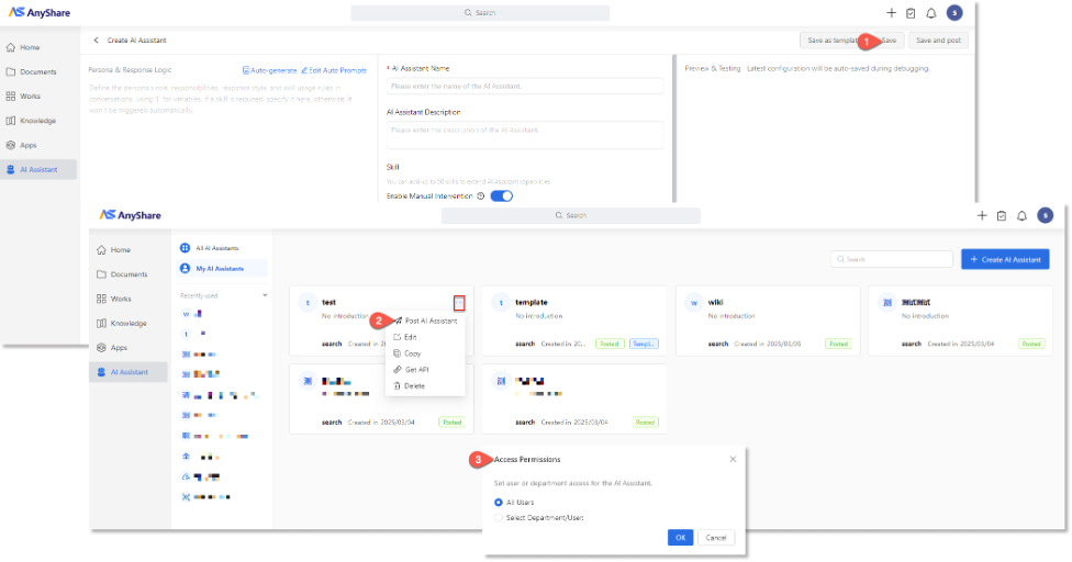 Click [Save] to store configurations without posting, or access the "My AI Assistants" list later to configure access permissions and post via the “