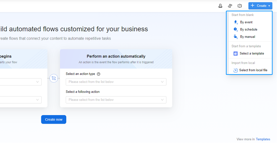 2. Start from a template. We have provided some templates of the most common used automated tasks in [Templates] to help you deal with all kinds of business scenarios.