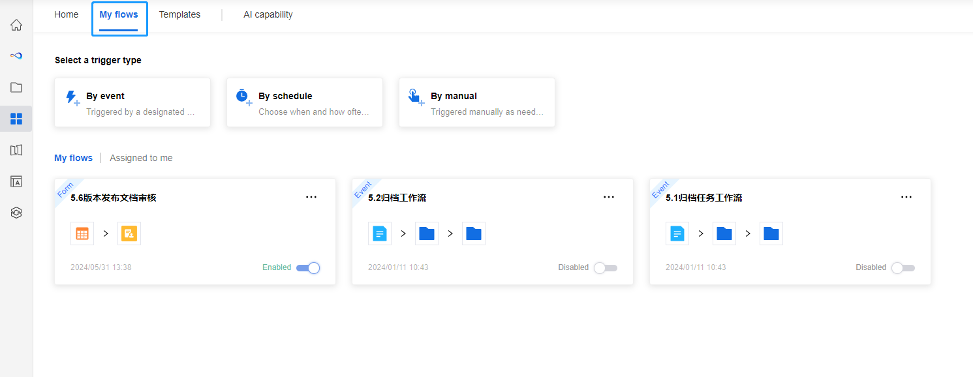 You may click [My flows] from the top bar of [Works] to administer the flows created by you and view the flows that are assigned to you.