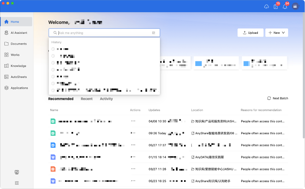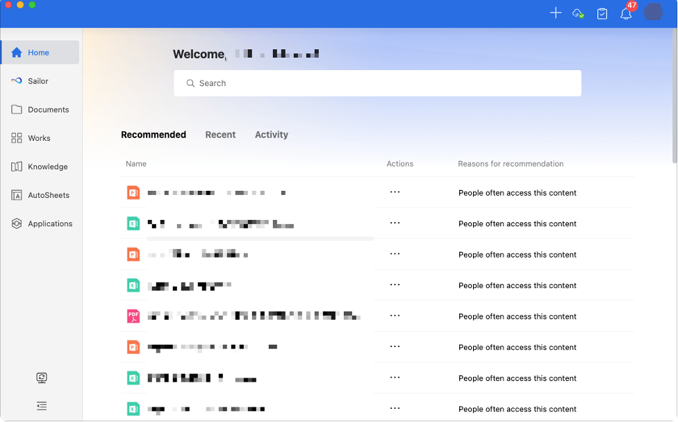 It intelligently recommends frequently accessed content, displays recently viewed documents, and provides real-time updates on both files and knowledge topics. This ensures users access key information quickly, handle tasks efficiently, and stay on top of to-dos, ultimately improving overall work productivity.