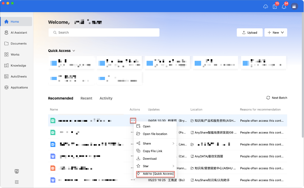 › Quick Access: Displays your frequently used knowledge objects that you've added, including documents from Document Center, knowledge resources (such as KnowledgeBases, WikiDocs, and Knowledge Topics) from Knowledge Center, AutoSheets, as well as frequently accessed files and folders from your searches.