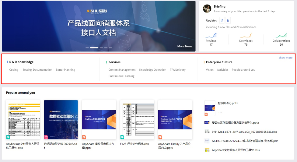 This section will present the documents browsed by members of the organization according to the corresponding popularity through intelligent algorithms so that each member of the organization can follow up on the corresponding content on time and integrate it into the work quickly.