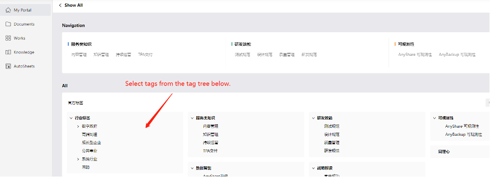 AnyShare provides the new official tag system, which can be displayed both on the My Portal page and the Intelligent Search page.