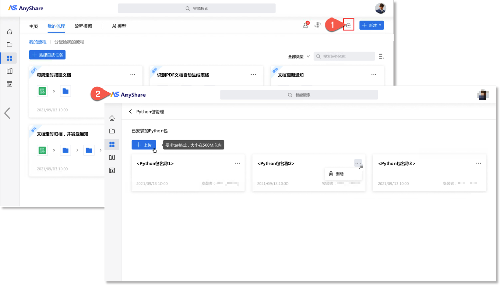 ” button in Works and select [+Upload] to upload a “.tar” file. AnyShare will automatically installs the package upon upload.