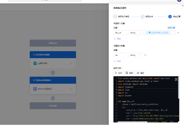 2) The Python node accepts an input variable (e.g., doc_id), which carries the document ID of the triggering file for node operations.